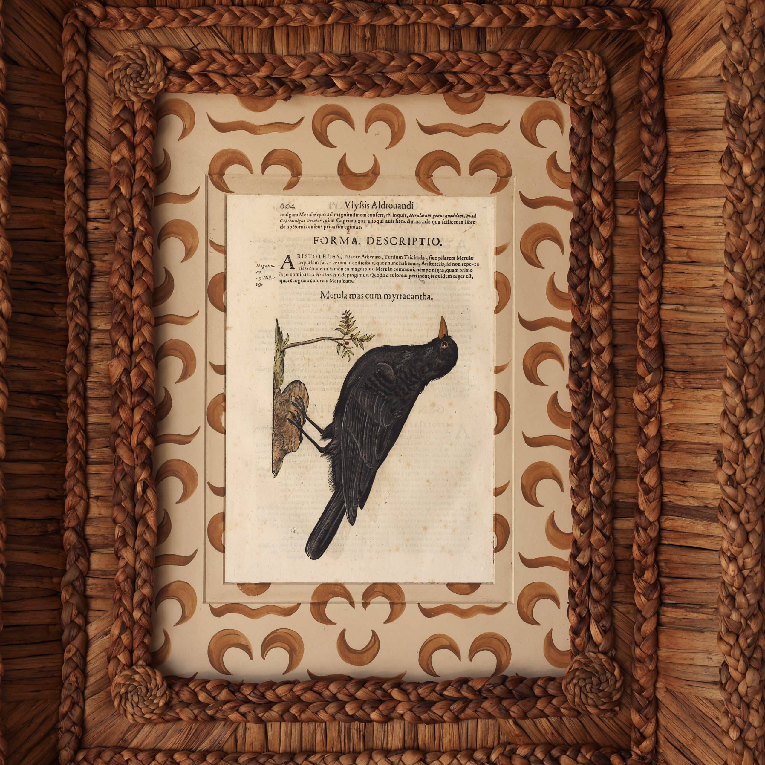 17th C. Hand Colored Aldrovandi Engraving in Gusto Woven Frame and Chintamani Mat VI