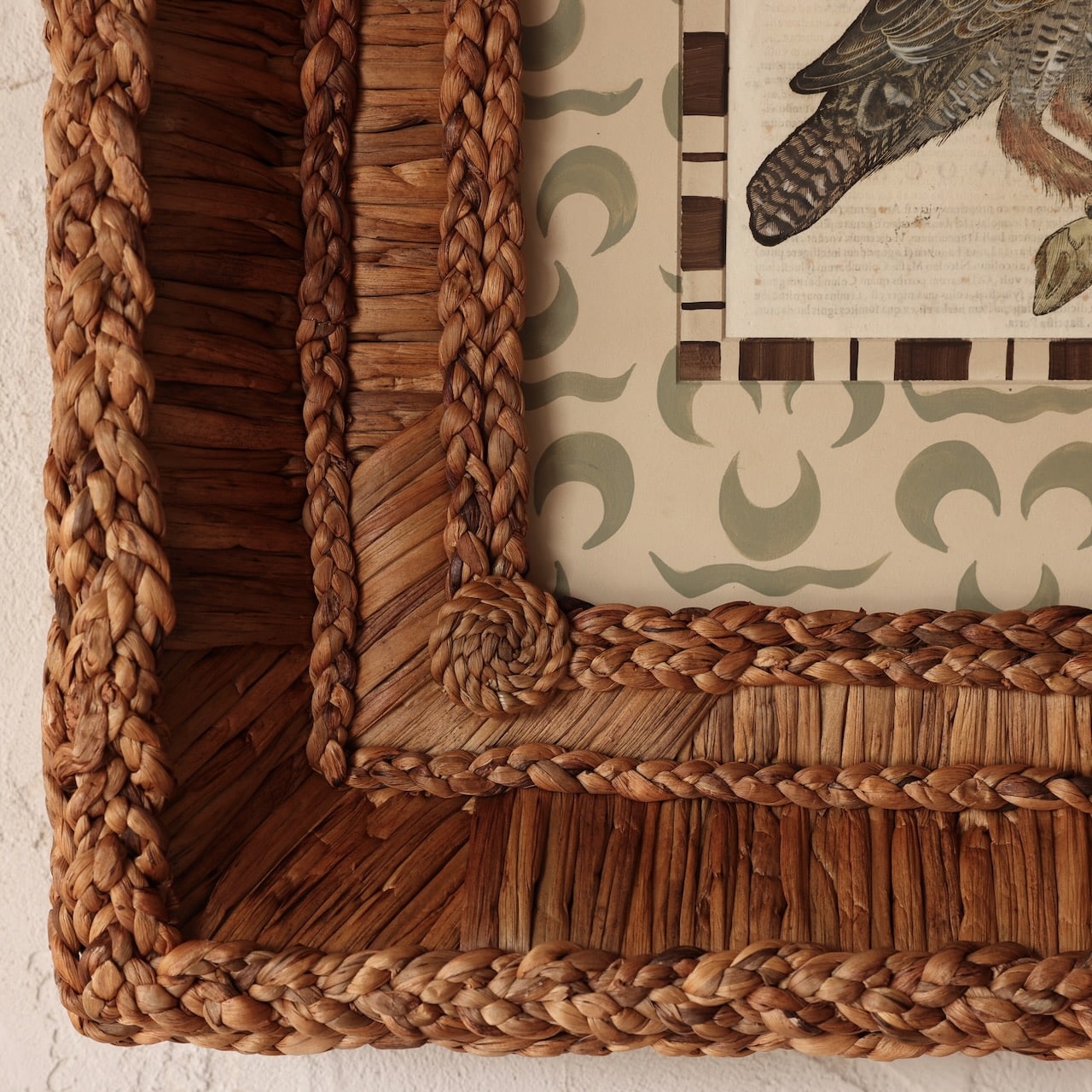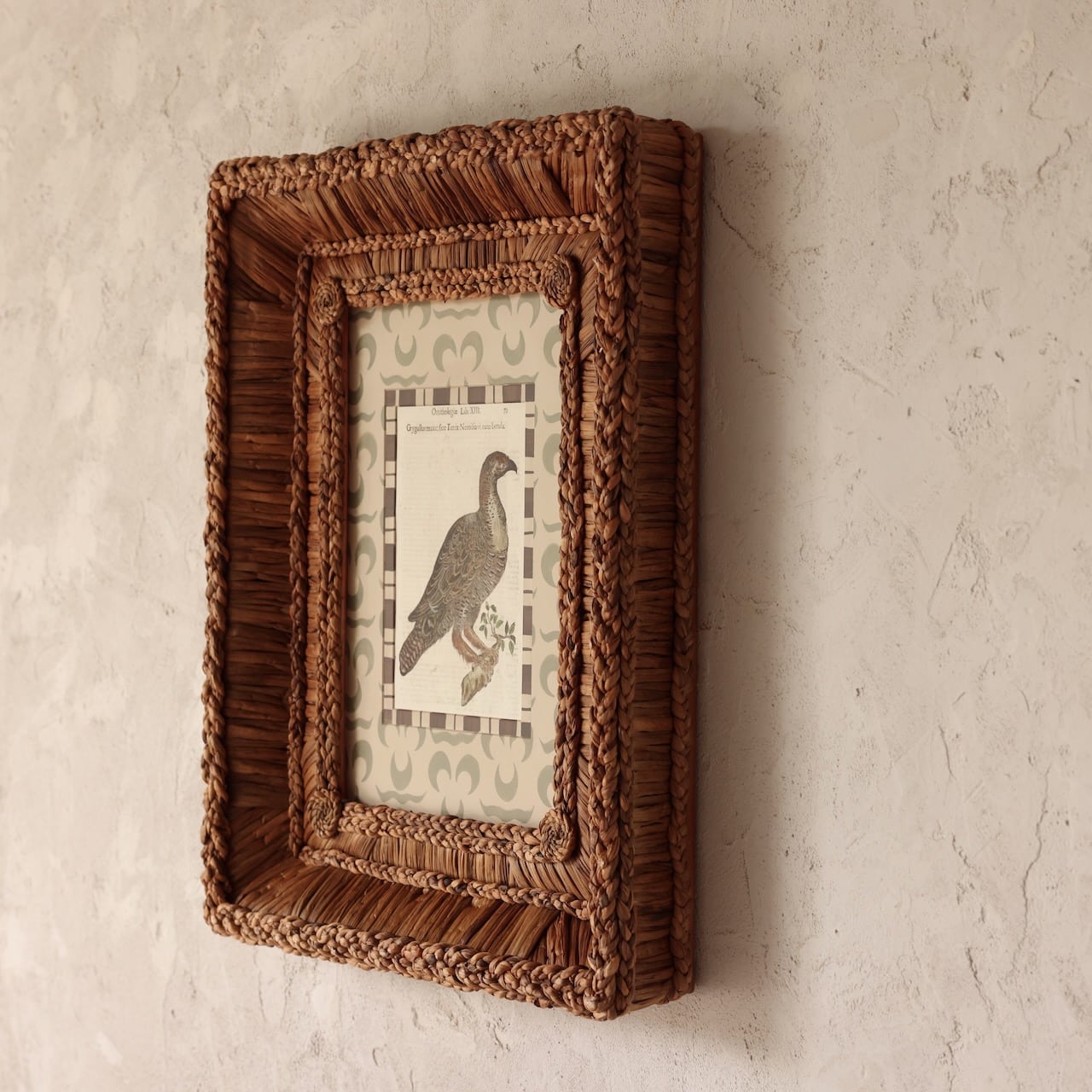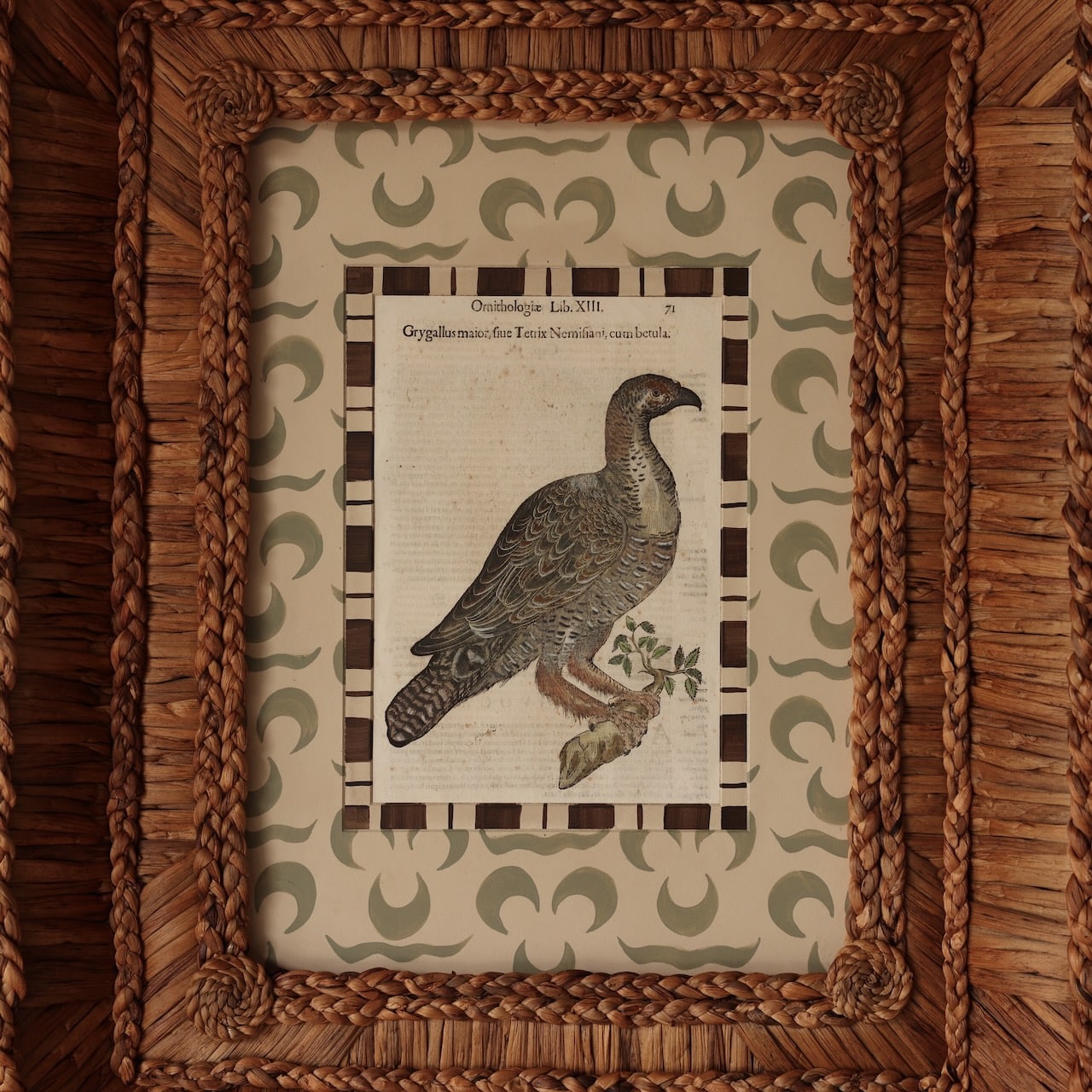 Aldrovandi Engraving encased in our hand-woven frame, hand-tied and knotted, featuring a hand-painted mat.