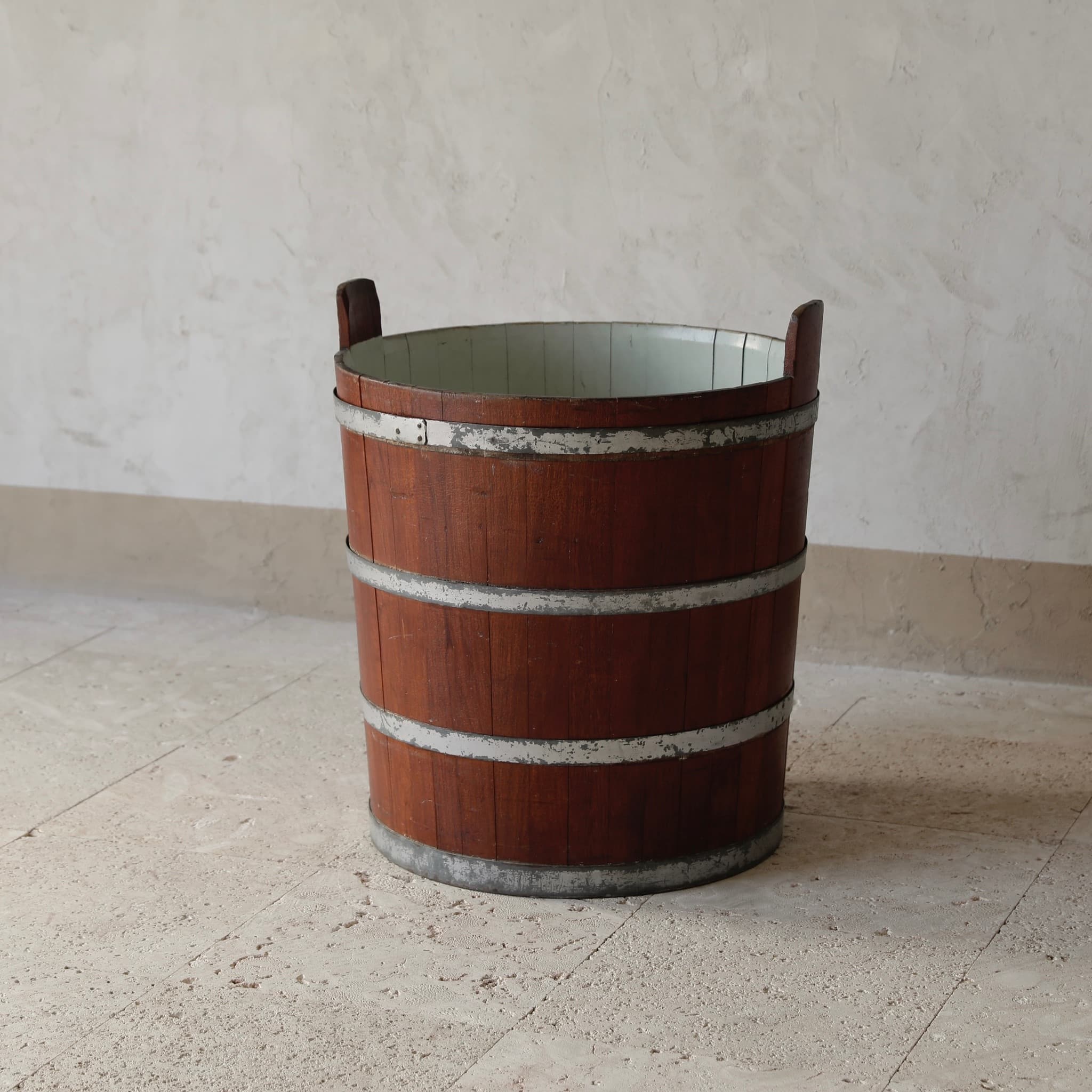 Large 20th C. Coppered Log Bin Barrel with Handles
