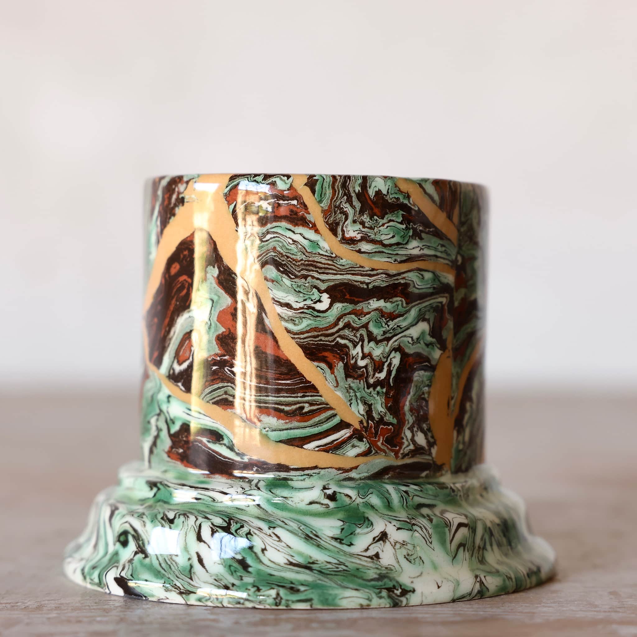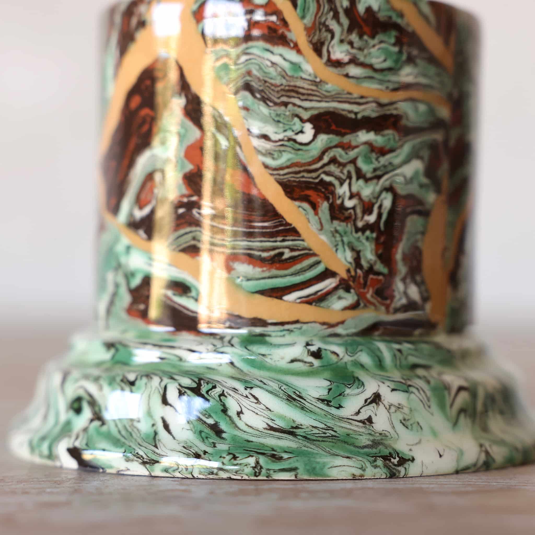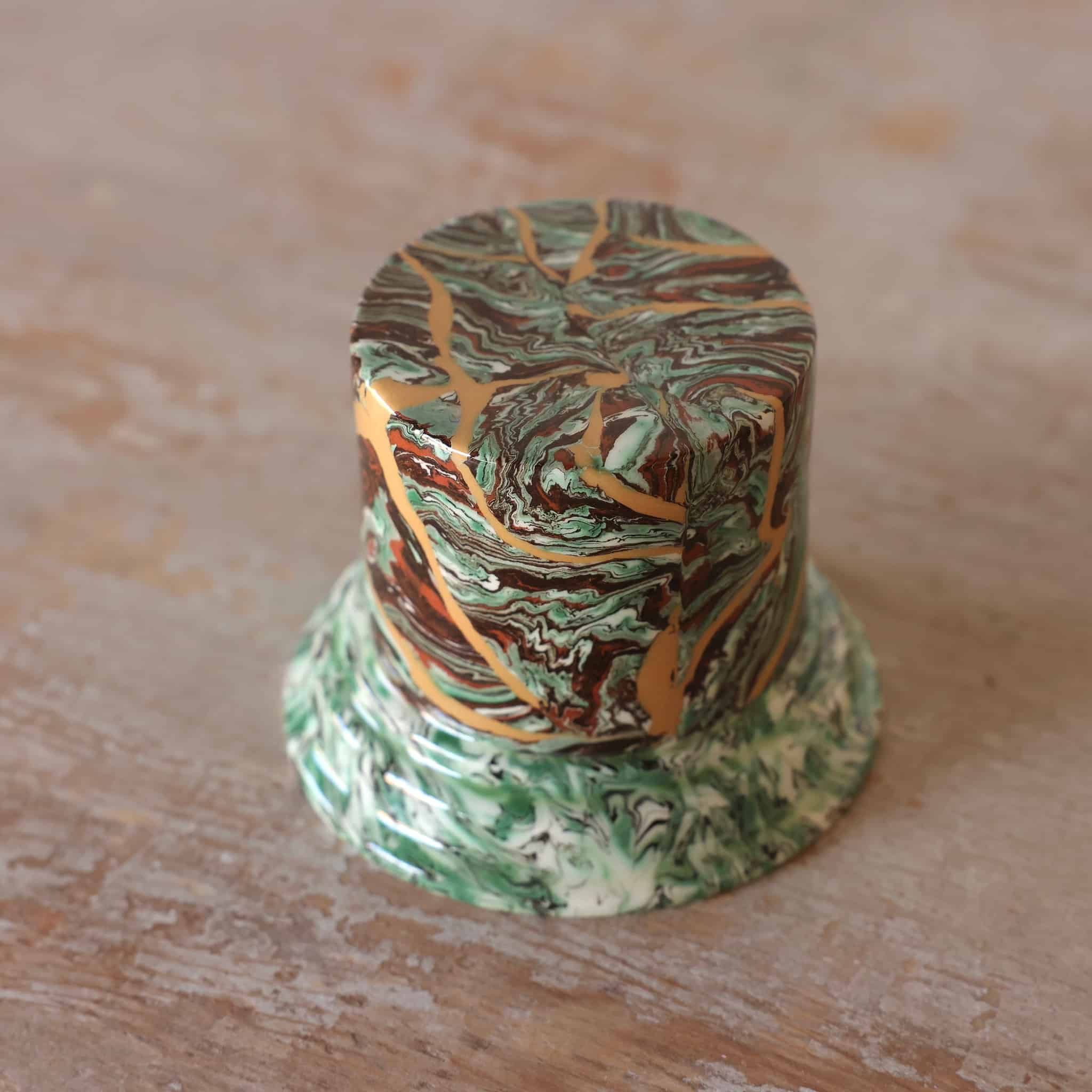 The long and meticulous technique consists of mixing different color clays in a completely arbitrary, yet fully mastered manner. It is a rigorous play with the volumes formed by the kneading of colored clay, obtained by the mixing of white clay with natural pigments. (iron, copper). Each piece, which is unique, requires several hours of manufacturing. The project is to carry on this old technique of refined artistic craftsmanship applied to everyday decorative dishes.